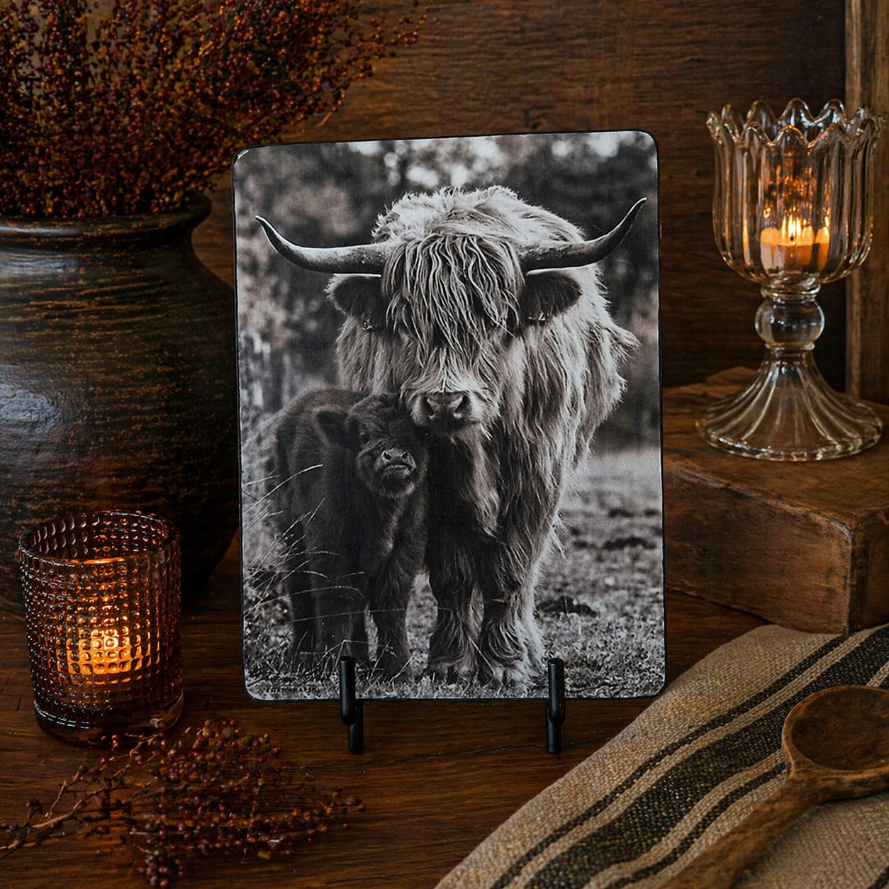 Dit prachtige nostalgische bord met Schotse hooglander en kalf brengt een gevoel van rust en eenvoud in huis 🐂✨